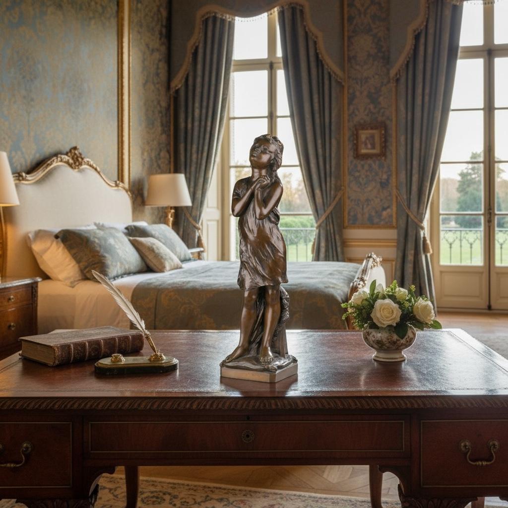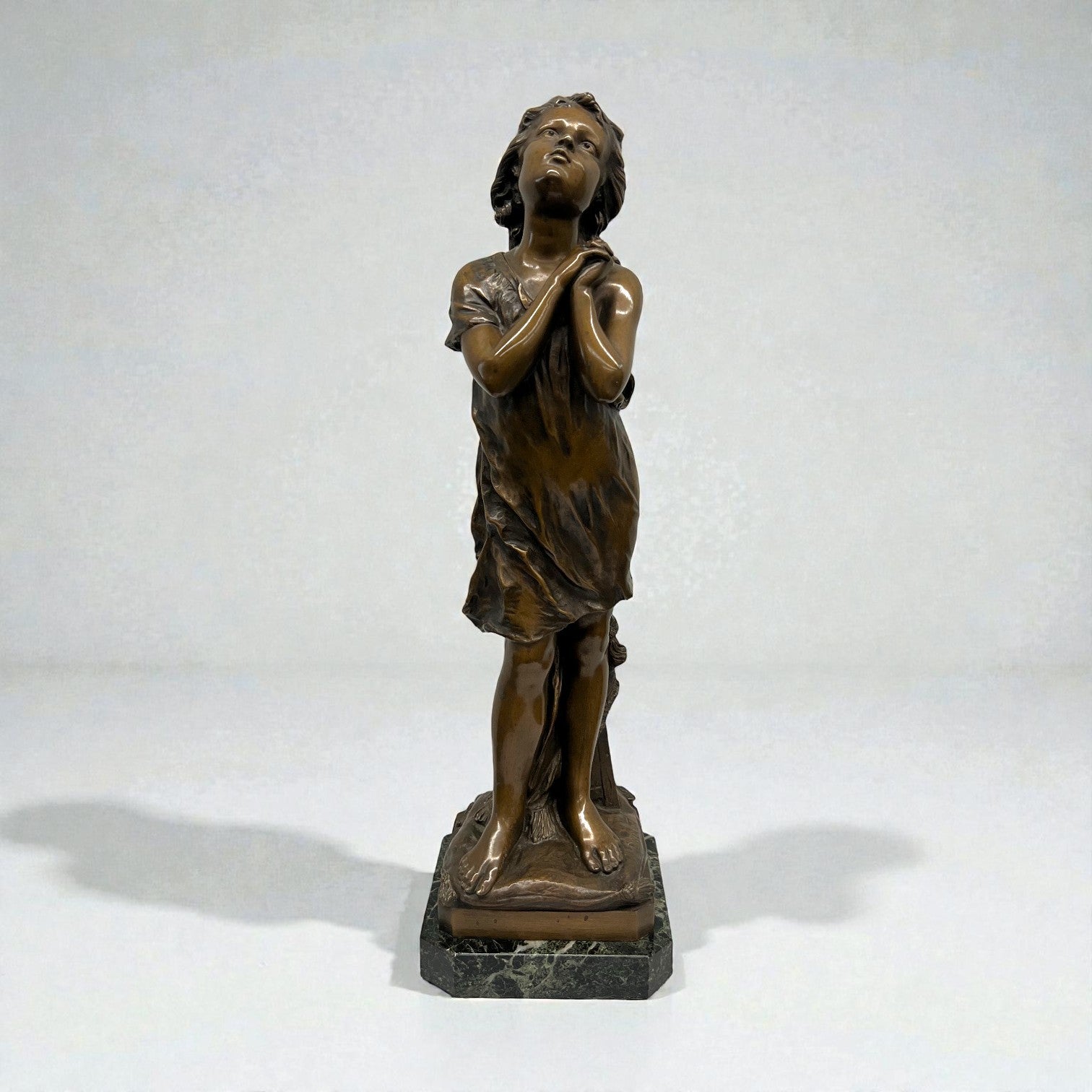“Fillette” by the French sculptor Edouard Drouot (1859-1945). This 17.72” artwork depicts a young girl standing with her hands clasped and looking upward, showcasing a rich, nuanced brown patina. This piece is a post-mortem edition casting, produced from the artist’s original work after his death. Drouot is renowned for his realistic and graceful depictions of figures, and his works are often found in various collections and at auction.