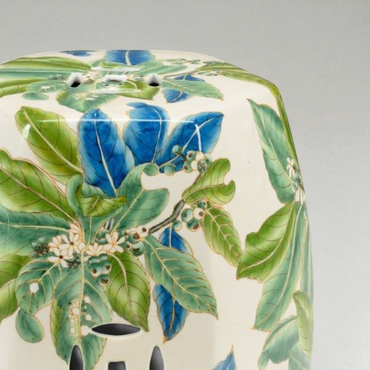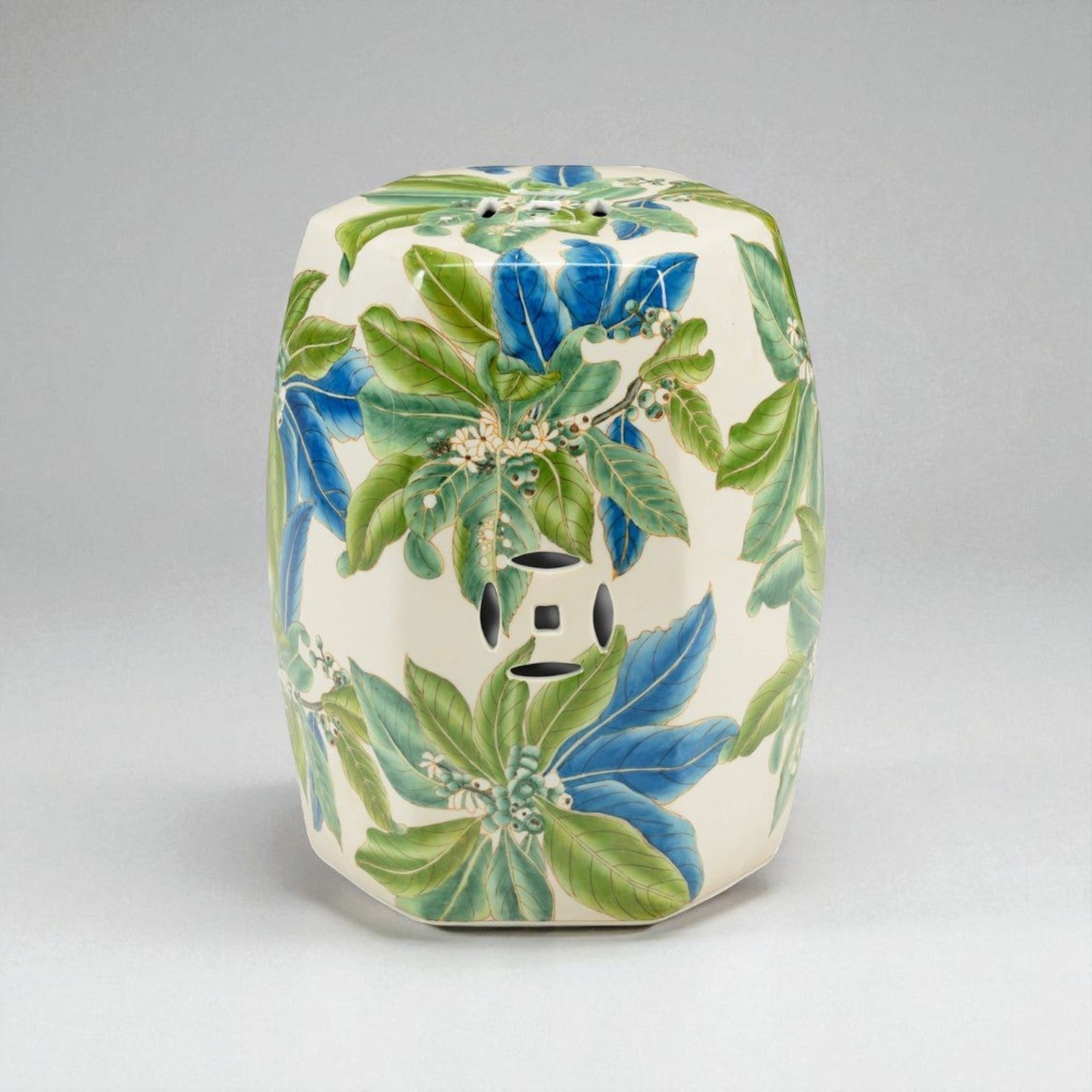 Introducing Chelsea House’s “Floral Garden Seat,” a stunning masterpiece created from off-white crackle-glazed porcelain. Adorned with green and blue leaves, delicate flowers, and off-white berries.