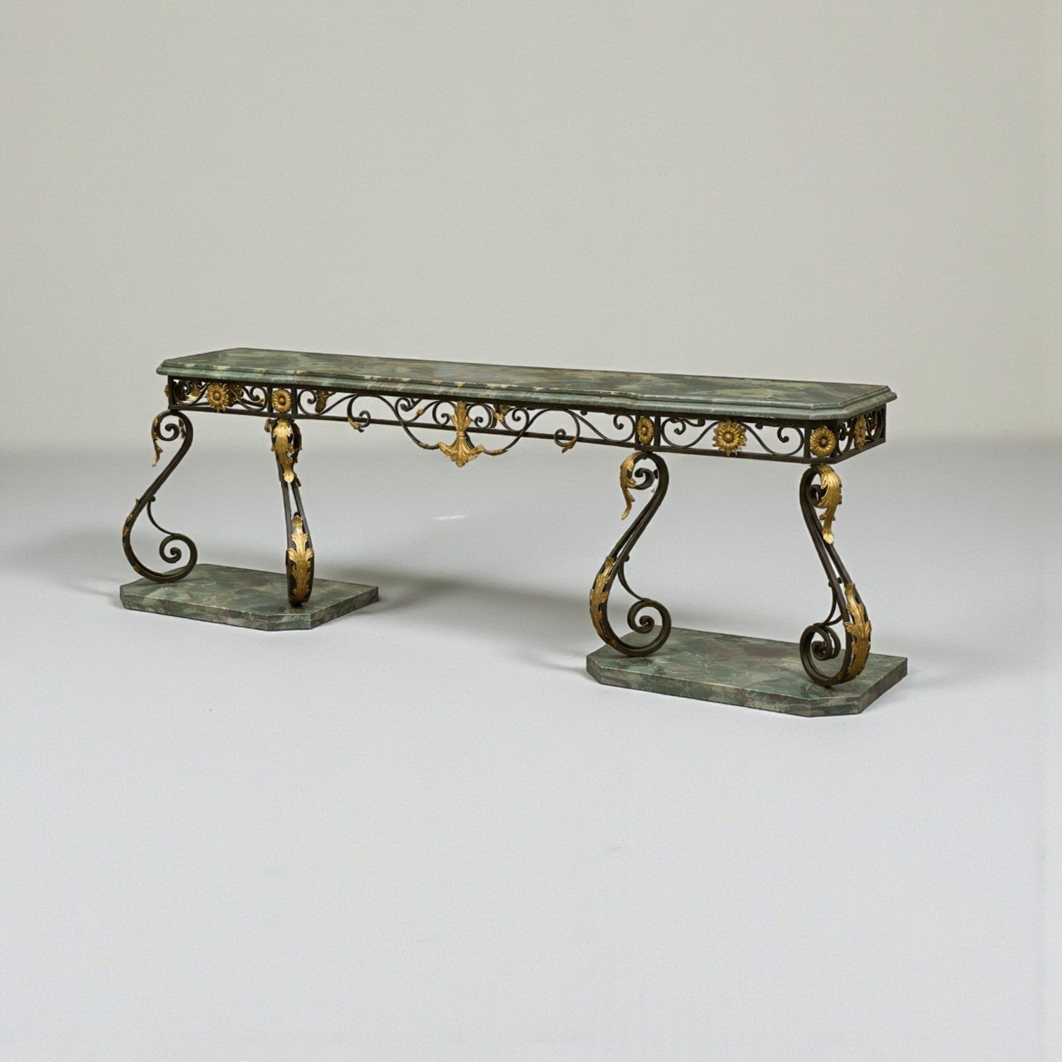 The green marble with gilt iron exudes a timeless appeal, embodying a Palm Beach/Dallas old money aesthetic.